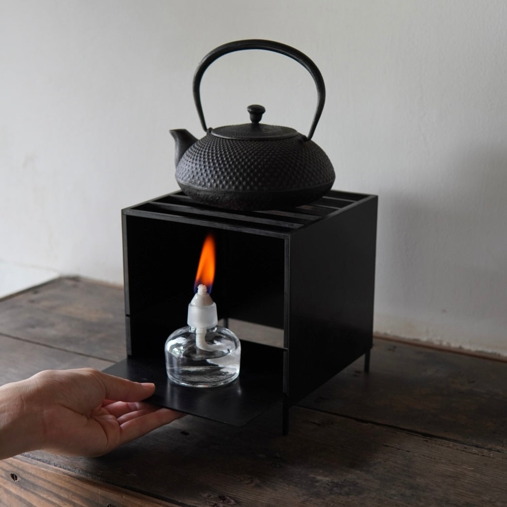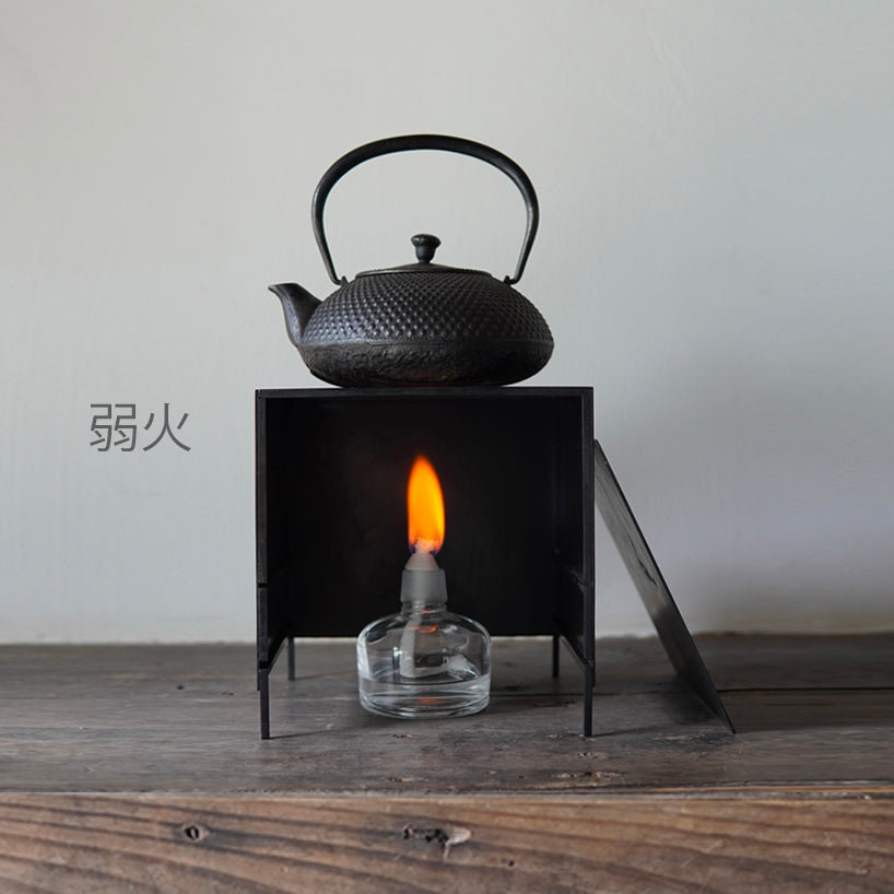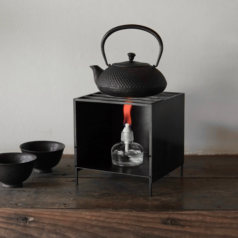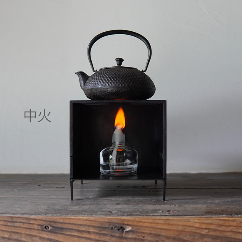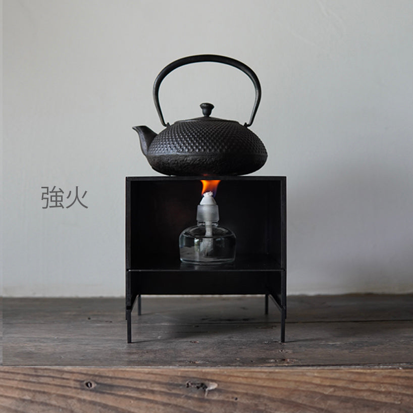 卓上炉は、炉や囲炉裏などの「火床(ひどこ)」を身近に楽しめるように設計された湯沸かし・保温器具です。灰の代わりにアルコールランプを用いることで、テーブルの上でも安心してご使用いただけます。さらに、中板の高さを調整すると、弱火・中火・強火の三段階で火力を切り替えることができ、用途に応じた火加減をお楽しみいただけます。